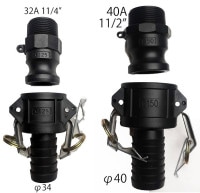 レバー式のプラスチックホースカップリングです。 オス・メスセット 手押しポンプからサクションホースで汲み上げたい場合などにあると便利です。 サイズは2種類。 ・32A 1 1/4"、内径32mmのホース接続 ・40A 1 1/2"、内径38mmのホース接続